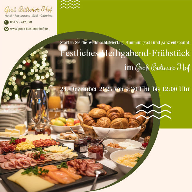 Am 24. Dezember 2025 von 9:30 Uhr bis 12:00 Uhr laden wir Sie herzlich ein, die besinnliche Zeit bei unserem großen, festlichen Heiligabend-Frühstücksbuffet einzuläuten. Bevor die Aufregung des Heiligen Abend beginnt, genießen Sie in gemütlicher Atmosphäre bei uns im Hotel & Restaurant Groß Bültener Hof einen kulinarischen Vormittag.